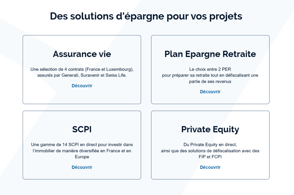 Nous le considérons comme un véritable cabinet de gestion de patrimoine indépendant… mais 100 % en ligne. L’offre est aussi riche et diversifiée que celle que vous retrouveriez chez un conseiller traditionnel : contrats d’assurance-vie, plan épargne retraite (PER), contrats de capitalisation, SCPI, mais aussi produits structurés et fonds de Private Equity.