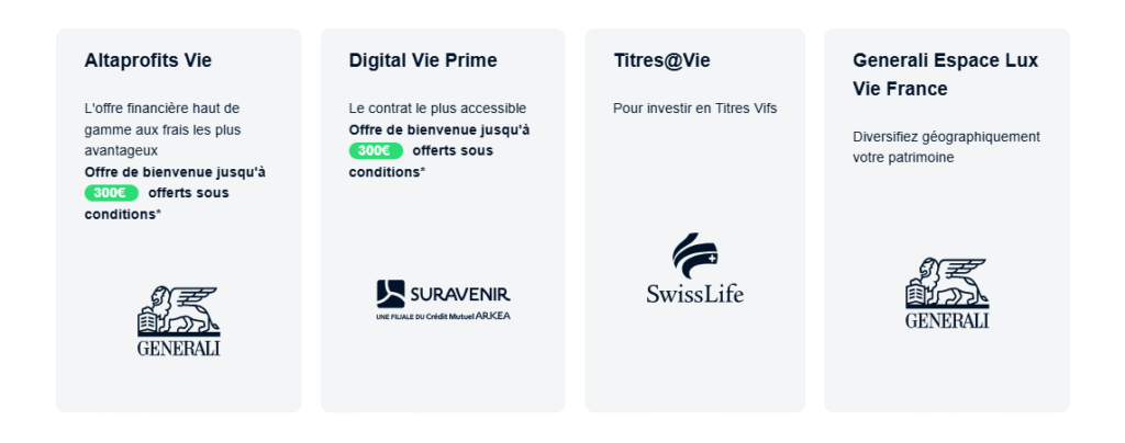 - Assurance-vie (4 contrats) : Altaprofits Vie, Digital Vie Prime, Titres@Vie, Generali Espace Lux Vie France