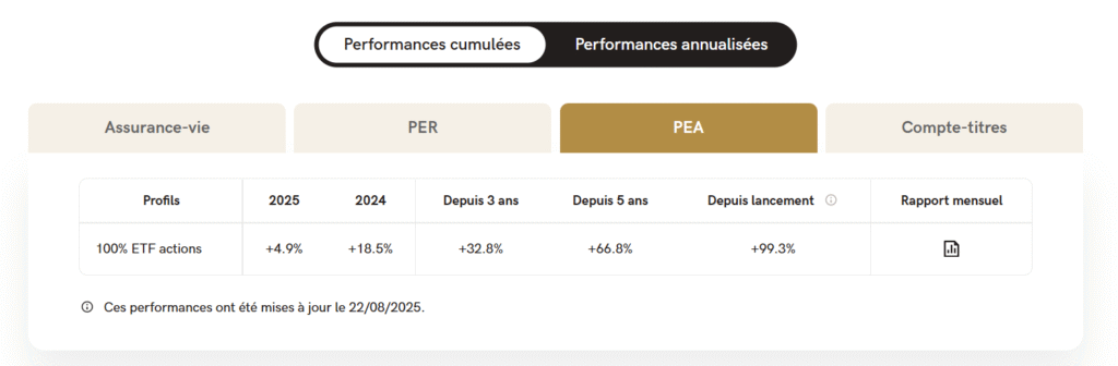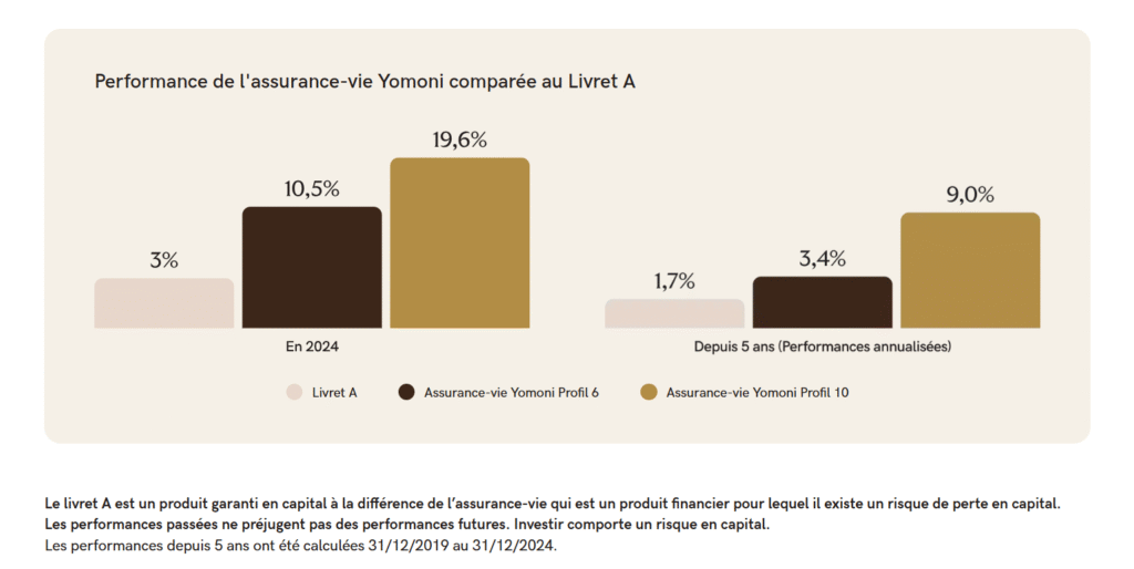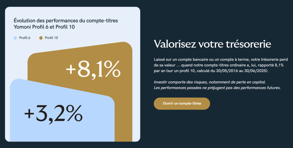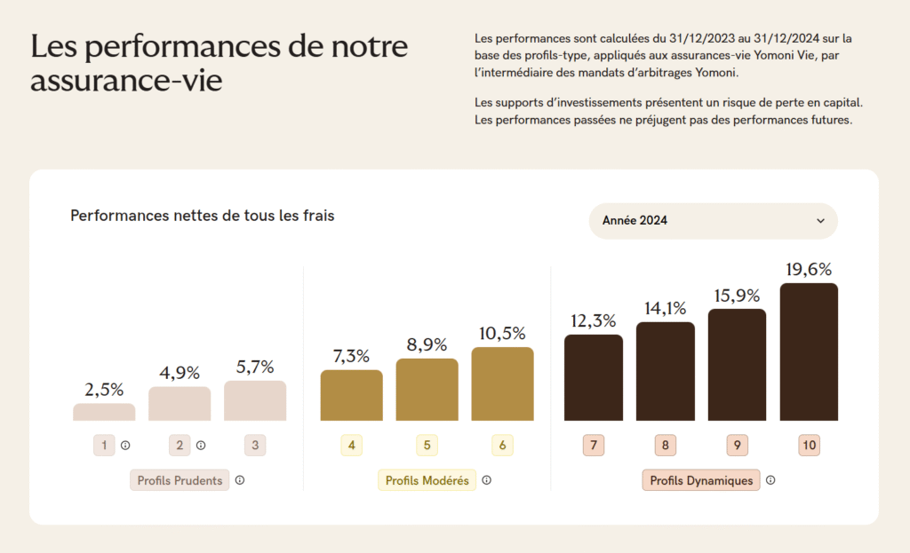 Chez Yomoni, vos résultats dépendent logiquement de l’enveloppe (assurance-vie, PEA, etc.) et de votre profil de risque (de très prudent à très dynamique).