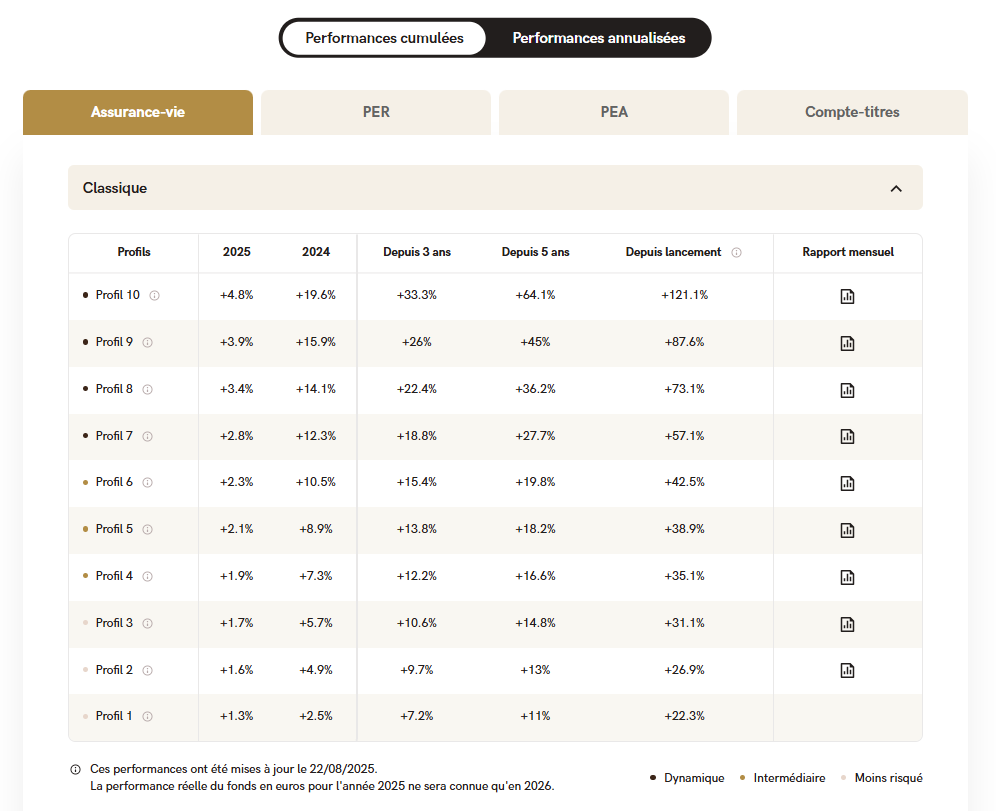 A titre d’exemple, voici la présentation des performances cumulées pour les 10 profils sur l’assurance-vie Yomoni Vie avec en bout de ligne de chaque profil le rapport mensuel disponible comme nous venons de vous le décrire qui reprend toutes les informations décrites.