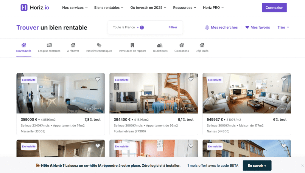 Il centralise toutes les offres disponibles sur le marché, les trie, les filtre, et vous permet de détecter les pépites adaptées à votre stratégie d’investissement.